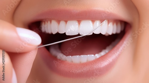 Woman flossing teeth, healthy smile, close-up, dental hygiene (1)