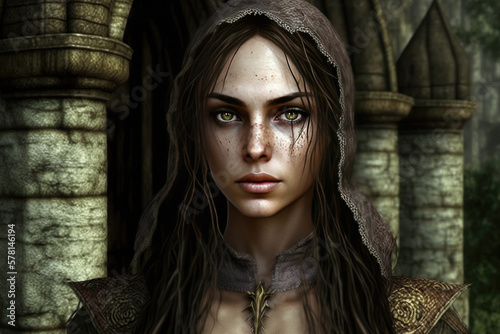 woman from the middle ages, hood, green eyes