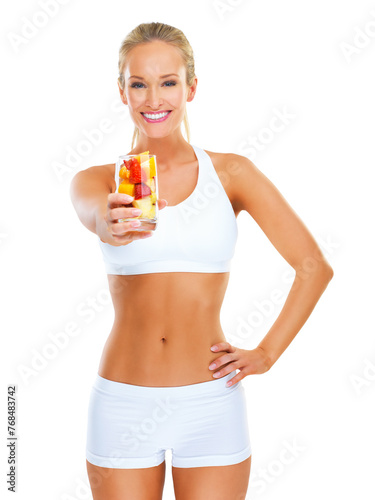 Woman, fruit and portrait for exercise, diet and fitness goals on white background. Young person, nutritionist or dietician and smile with snack for health and happy for detox, workout and weightloss