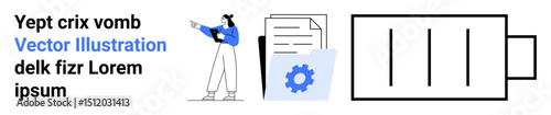 Woman gesturing while discussing with documents, cogwheel, and battery icon symbolizing analysis, efficiency, and progress. Ideal for productivity, business, energy management, strategy tech