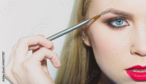 Woman half face drawing eyebrow with makeup brush