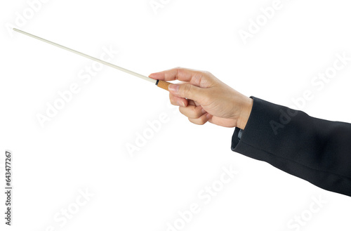 Woman hand holding Baton or Magic wand conjured up in the air on white background, Miracle magical stick Wizard for fantasy story or music conductor isolate on white with clipping path.