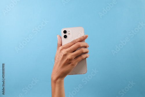 Woman Hand Holding Smartphone With Dual Cameras Isolated On Blue Background