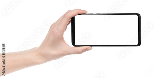 Woman hand holding the black new smartphone with blank screen isolated white background. hands using phone clipping path