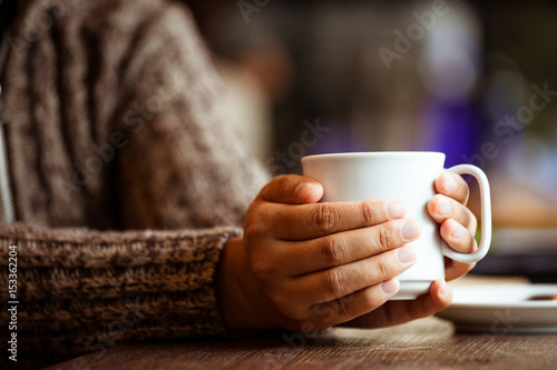 Woman hand holding the cup of coffee or tea in the cafe in rainy day in vintage color tone