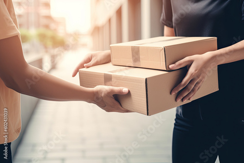 Woman hands accepting a delivery of box or parcel. Cardboard box delivery, gift concept. Generative AI