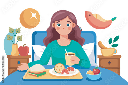 Woman having breakfast in bed flat vector illustration Girl lying in bed and eating healthy food.eps