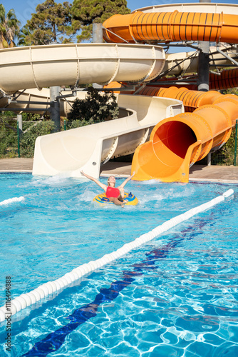 woman having fun at an aquapark, enjoying the water slides and pools under the summer sun.