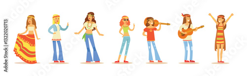 Woman Hippie Dressed In Classic Subculture Clothes Vector Set