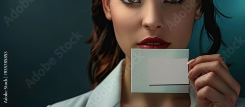 Woman holding a gift box and displaying a business card to the camera front view close up with a background featuring copy space suitable for advertising or a slogan