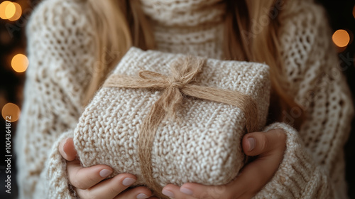 Woman holding knitted gift, cozy winter sweater, holiday season