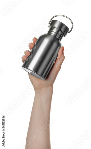 Woman holding metal bottle on white background, closeup. Conscious consumption