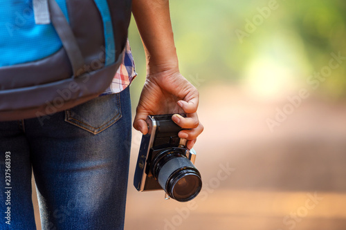 woman holding old vintage camera