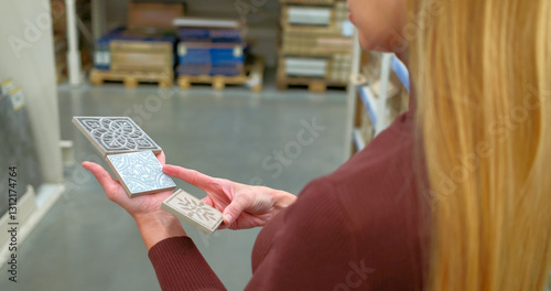 Woman Holding Three Decorative Tiles in a Home Improvement Store