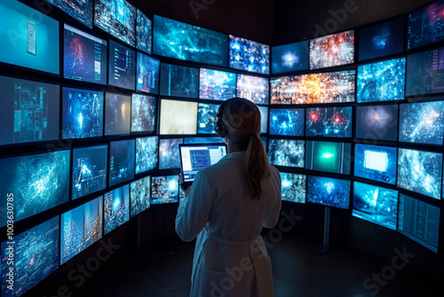 Woman in a futuristic laboratory with a monitor looks at a laptop