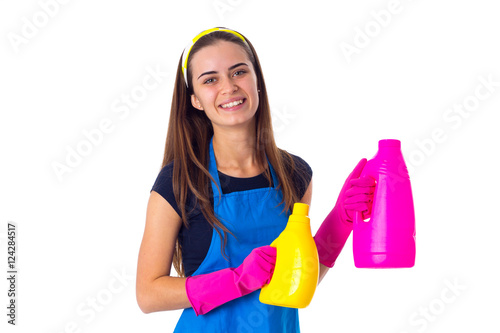 Woman in apron holding a detergents