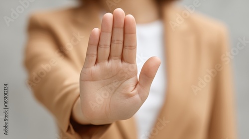 Woman in beige jacket holding up hand, signaling stop or pause gesture, conveying communication, boundaries, and assertive interaction in business or personal setting