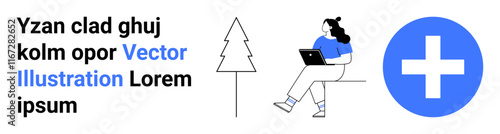 Woman in blue using laptop on a bench, nearby tree outline, large blue healthcare plus symbol. Minimalistic design. Ideal for healthcare, technology, remote work, relaxation, nature, simplicity