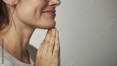 "Woman in close-up, smiling serenely."