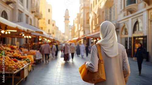 Woman in hijab explores vibrant Middle Eastern market at sunset, AI