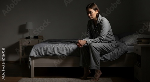 Woman in Pajamas Sitting on Bed in Dark Bedroom, Reflecting on Troubles