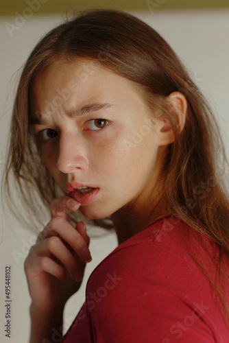 Woman in red shirt holding her chin