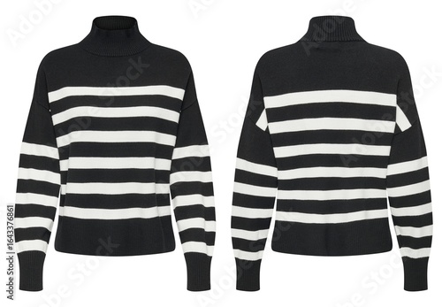 Woman in striped sweater front and back isolated on white background