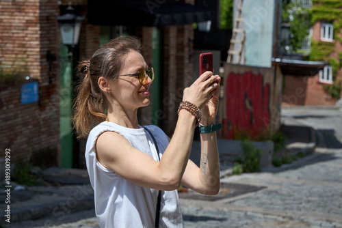 Woman in sunglasses taking a photo with a smartphone on a sunny cobblestone street, wearing a white sleeveless top and bracelets, with brick buildings and greenery in the background.