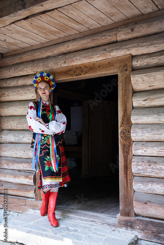 Woman in traditional costume. Ukrainian woman near the old house. A young woman in a national Ukrainian costume. Embroidery. Ukrainian national clothing.