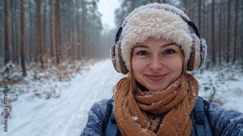 Woman in Winter Clothes Smiling in Snowy Forest