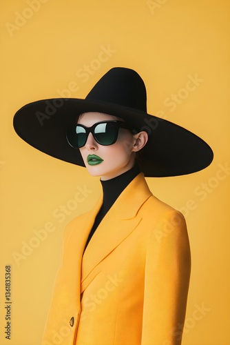 Woman in yellow jacket and oversized black hat with sunglasses on yellow background. Fashion portrait. Elegant and stylish look. Concept of luxury and haute couture.