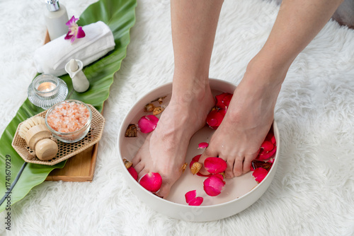 Woman indulges in blissful foot massage at luxurious spa salon while masseur give reflexology therapy in gentle day light ambiance resort or hotel foot spa. Quiescent