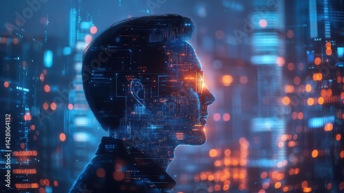 Woman interacts with futuristic technology interface, glowing blue and red light.