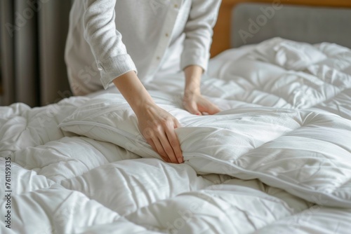 Woman is putting the bedding cover or mattress pad on the bed or putting off for cleaning process
