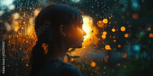 Woman is standing in the rain with her hair in a ponytail. The streetlight is shining through the rain