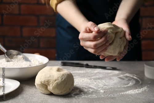 Woman kneading raw dough at light grey table, closeup