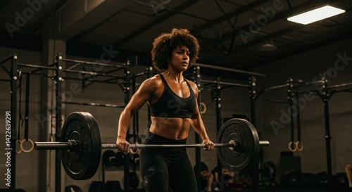 Woman lifting barbell in a well-equipped gym with industrial lighting