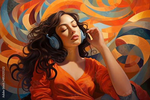 Woman Listening to Music in Abstract Orange and Blue Setting