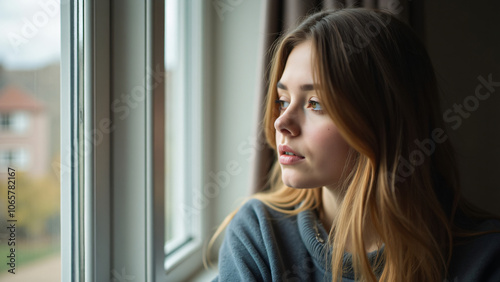 woman looking through window
