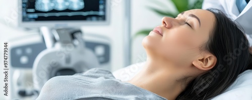 Woman lying down during a medical exam, fertility specialist performing ultrasound, professional clinical setting infertility, exam