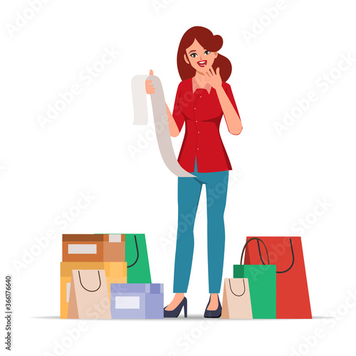 Woman make shocked face with long bill. Customer Shopping many bags.