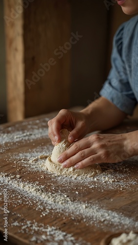 Woman making dough by hand.