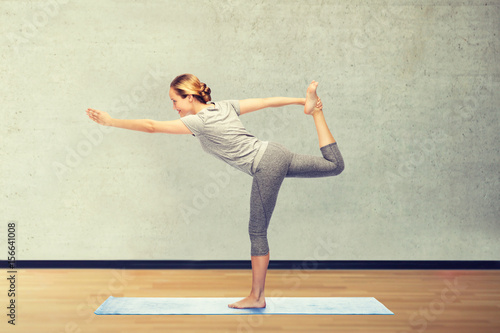 woman making yoga in lord of the dance pose on mat