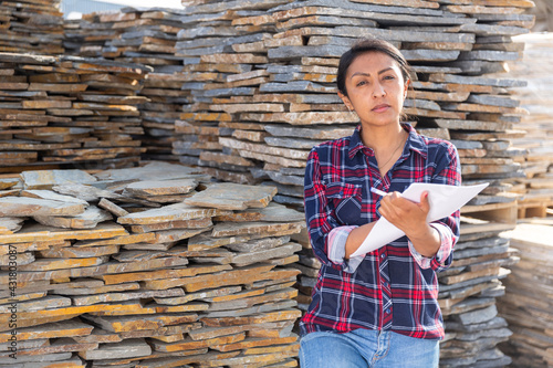 Woman manager of a hardware store keeps records of natural stone tiles