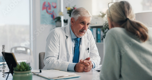 Woman, mature doctor and discussion in clinic for medical services, consultation or opinion. People, symptoms and patient in conversation for appointment, checkup and healthcare with treatment advice