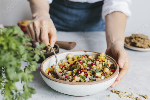 Woman mixing salsa in bowl
