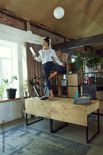Woman, office employee in formal wear standing on desk in yoga pose and working with documents against loft settings. Concept of office life, balance between work and sport, business