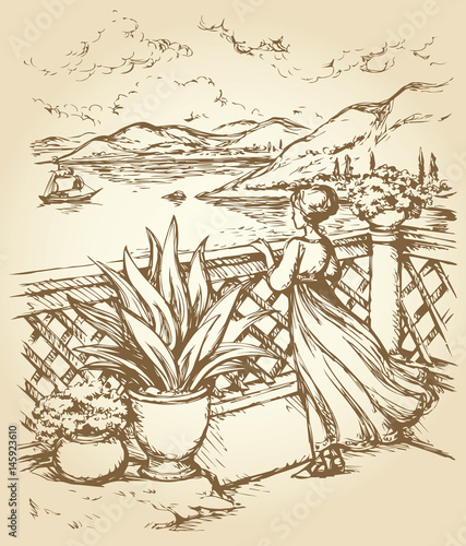Woman on terrace. Vector drawing