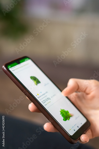 Woman orders fresh greens through a close-up mobile phone app. Online shopping concept. Vertical photo
