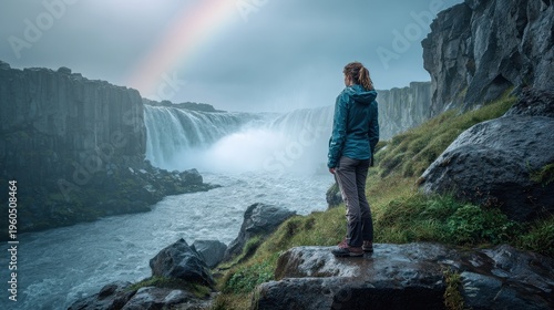 Woman overlooking a powerful Icelandic waterfall amid mist and basalt cliffs